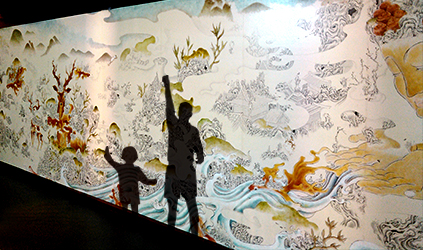 壁一面に水墨画で描かれた、奈良を象徴する鹿と大仏。